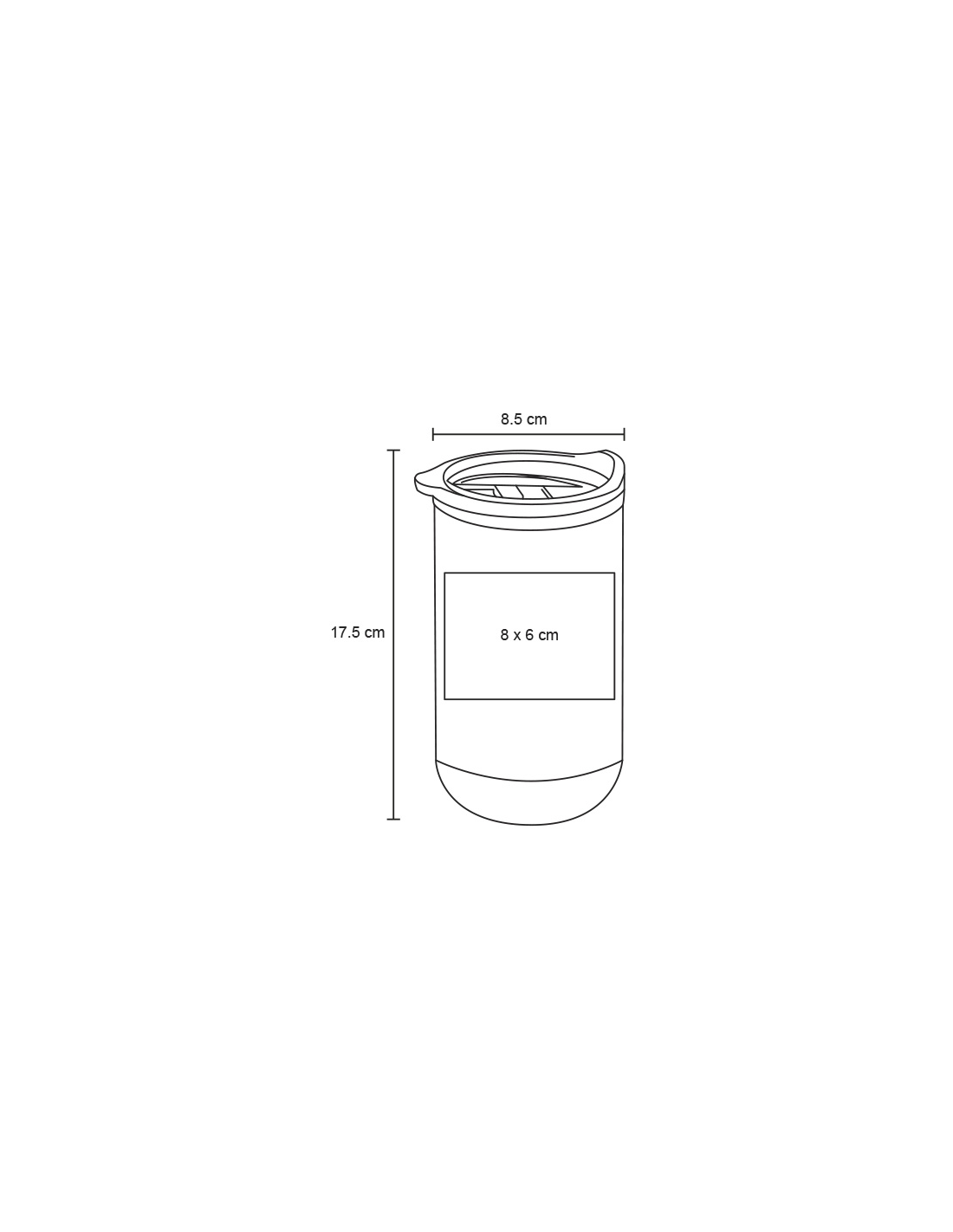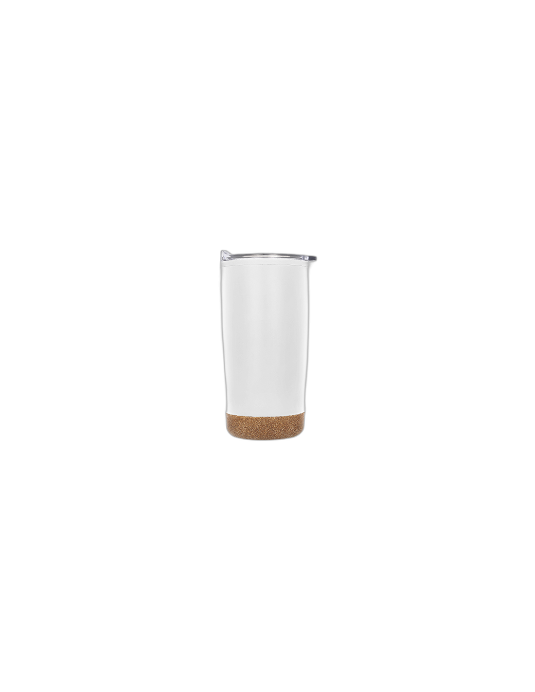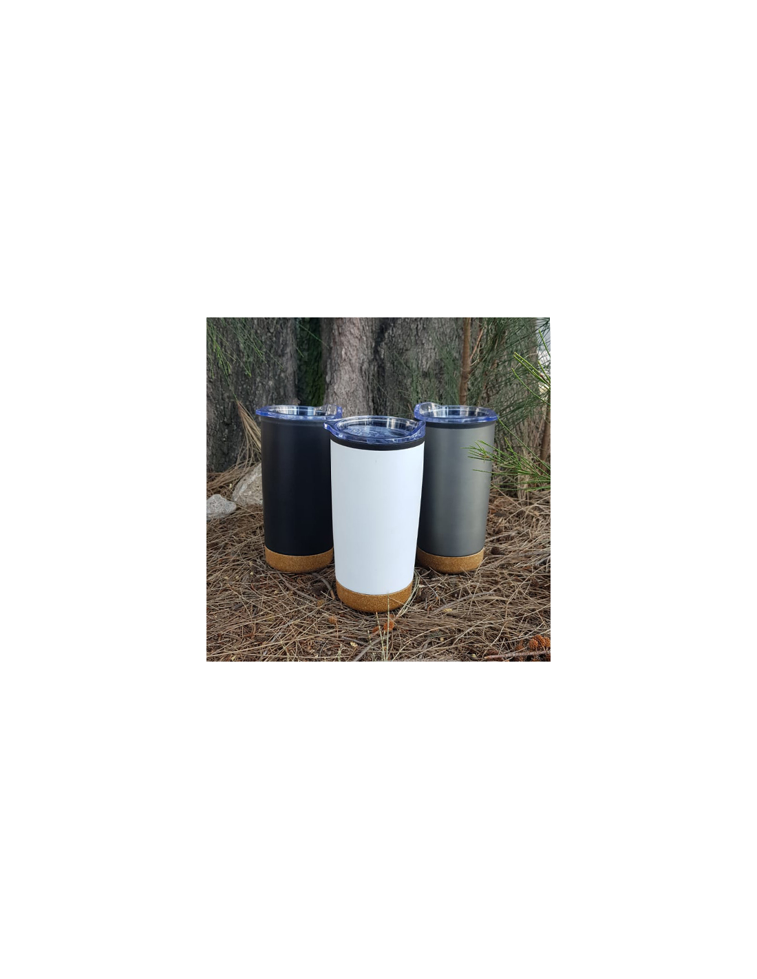 Termo con doble pared de acero inoxidable e interior de plástico, base de corcho, tapa traslúcida a presión con seguro deslizable y boquilla.